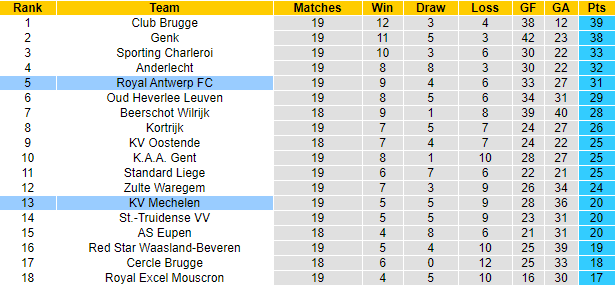 Sau 19 vòng đấu tại giải VĐQG Bỉ mùa này, Mechelen mới giành được 20 điểm, xếp thứ 13 trên bảng xếp hạng. Trong khi đó Royal Antwerp đã giành được 31 điểm trước trận đối đầu ở vòng 20, hiện đang xếp ở vị trí thứ 5.