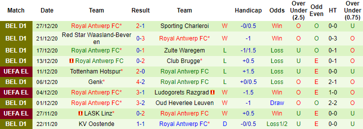 + Thống kê 10 trận gần nhất của Royal Antwerp
