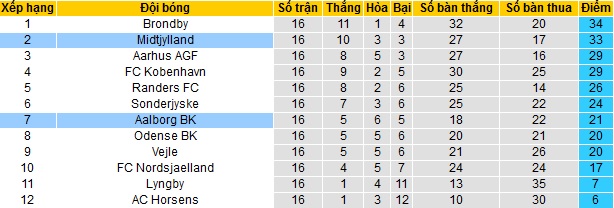 Bảng xếp hạng giải VĐQG Đan Mạch trước vòng 17