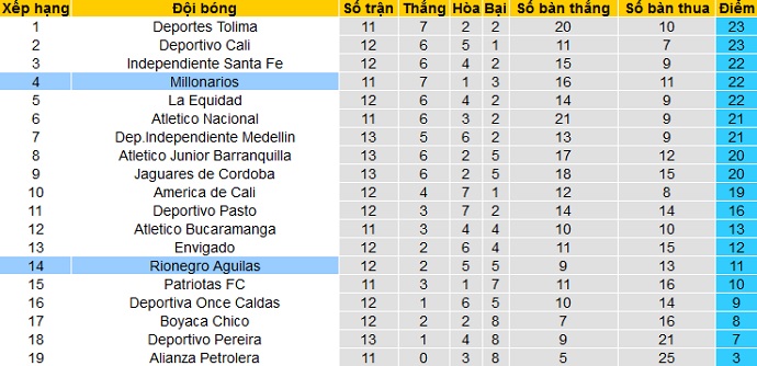 Trong khi đó Millonarios đang nằm trong Top 8 của giải khi đứng ở vị trí thứ 6 với 22 điểm sau 12 vòng đấu. Hiện tại Millonarios chỉ còn đang kém 3 đội đầu bảng đúng 2 điểm trong khi hơn các đội nằm ngoài Top 8 cũng chỉ là 2 điểm.