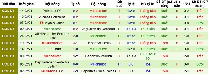 Ở 5 vòng đấu gần nhất Millonarios có được 3 trận thắng, để thua 2 trận. Ngay cả trên sân khách sau 1 trận hòa và 2 trận thua từ đầu mùa giải, Millonarios đang toàn thắng ở cả 3 lần du đấu gần nhất.