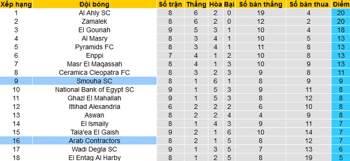 Trong khi đó Smouha đang đứng thứ 9 trên bảng xếp hạng nhưng cũng mới chỉ có được 9 điểm cũng sau 8 vòng đấu. Hiện tại đội bóng đang bị các đội phía sau bám đuổi rất sát, trong khi khoảng cách giữa họ với các đội Top 3 đã lên tới 9 điểm.