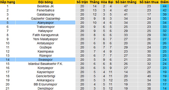 Bảng xếp hạng giải VĐQG Thổ Nhĩ Kỳ trước vòng 21
