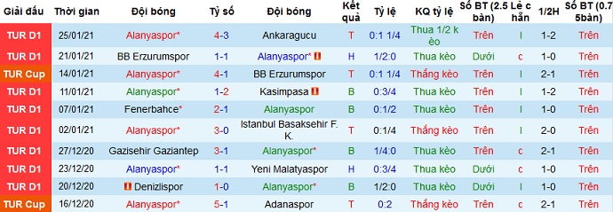 Trong 5 trận đấu gần nhất Alanyaspor có được 2 trận thắng, 1 trận hòa và để thua 2 trận. Tuy nhiên thành tích sân nhà của đội bóng có phần tốt hơn với 3 trận thắng, 1 trận hòa và 1 trận thua sau 5 trận gần nhất tại đây.