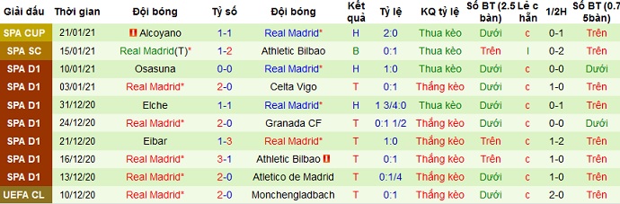 + Thống kê 10 trận gần nhất của Real Madrid