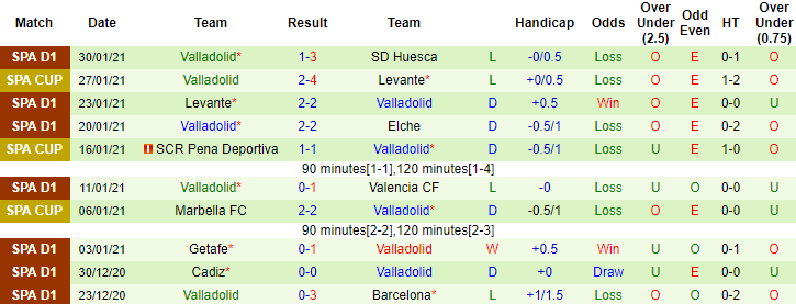 + Thống kê 10 trận gần nhất của Valladolid