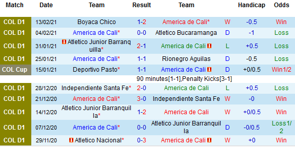 + Soi tỷ lệ kèo châu Á: America de Cali thua kèo châu Á tới 5 trong 8 lần tiếp đón Ind. Santa Fe trên sân nhà gần nhất tại giải Vô địch Colombia.