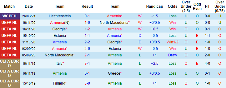 + Thống kê 10 trận gần nhất của Armenia