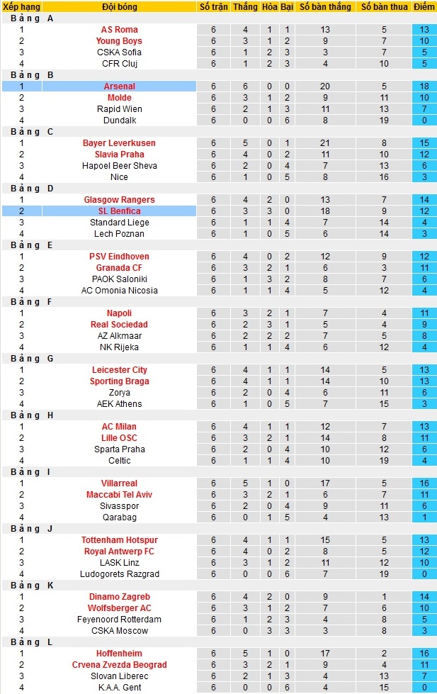 Bảng xếp hạng Europa League giai đoạn vòng bảng