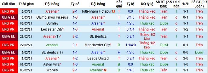 + Thống kê 10 trận gần nhất của Arsenal