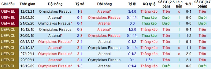 + Lịch sử đối đầu Arsenal vs Olympiakos