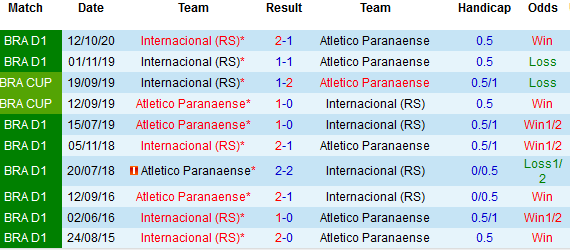 + Soi tỷ lệ kèo châu Á: Trên sàn giao dịch châu Á, Athletico Paranaense là cái tên rủi ro cho giới mộ điệu khi chỉ có 39.39% số trận thắng theo tỷ lệ từ đầu mùa. Thành tích tương tự của Internacional cao nhất giải với 63.64% số trận thắng.