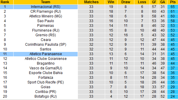 Còn 5 vòng đấu nữa sẽ kết thúc, Internacional tất nhiên vẫn phải duy trì được sự tập trung cần thiết để bước lên bục cao nhất. Nhiệm vụ giành chiến thắng của đội khách xem ra không mấy khó khăn khi phía đối diện chỉ là Athletico Paranaense đã khá thảnh thơi.