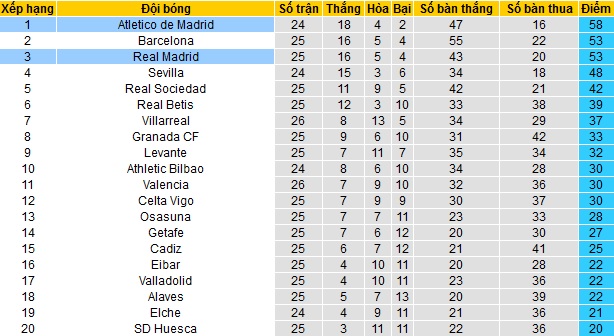 Trong khi đó Real cũng đã để mất điểm ở trận đấu mới đây với Sociead và hiện tại đã tụt xuống vị trí thứ ba của bảng xếp hạng, tuy vẫn cùng bằng điểm với Barcelona nhưng kém về hiệu số bàn thắng.