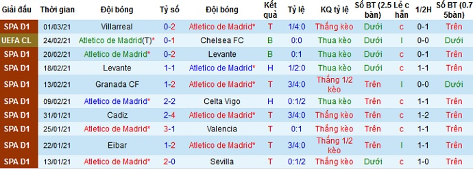 + Thống kê 10 trận gần nhất của Atletico Madrid