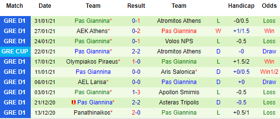 + Thống kê 10 trận gần nhất của PAS Giannina