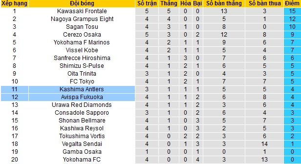 Bảng xếp hạng J-League vòng 5