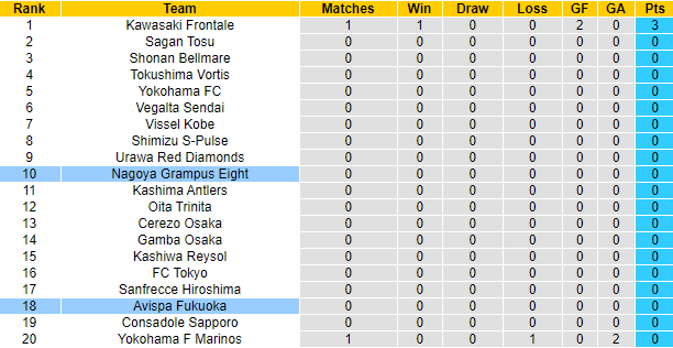 Avispa Fukuoka là tân binh mới thăng hạng tại giải VĐQG Nhật Bản mùa này. Ngay vòng đấu mở màn, Avispa Fukuoka đã phải đối đầu khắc tinh Nagoya Grampus. Trong vòng 9 trận đối đầu Nagoya Grampus trong quá khứ, Avispa Fukuoka thua 6, hoà 2 và chỉ thắng được 1 trận.
