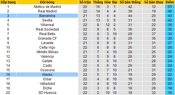 Trong khi đó Alavés đang đứng thứ 16 trên bảng xếp hạng với 22 điểm sau 22 vòng đấu. Hiện tại đội bóng chỉ đứng trên nhóm các đội cầm đèn đỏ có 2 bậc với khoảng cách cũng chỉ là 2 điểm. Tuy nhiên đây không phải là điều quá bất ngờ khi ở mùa trước Alavés cũng chỉ cán đích đúng ở vị trí thứ 16.