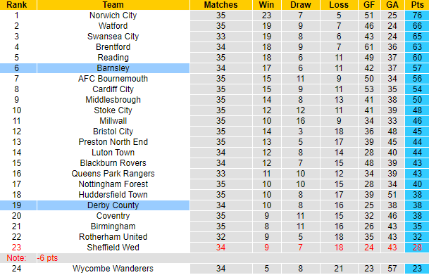 Barnsley đang xếp ở vị trí thứ 6 trên bảng xếp hạng Championship với 57 điểm sau 34 trận. Trong khi đó Derby County với 34 trận mới giành được 38 điểm. Khoảng cách giữa hai đội là 13 bậc và 19 điểm, hoàn toàn cho thấy sự vượt trội của Barnsley ở trận đối đầu sắp tới.