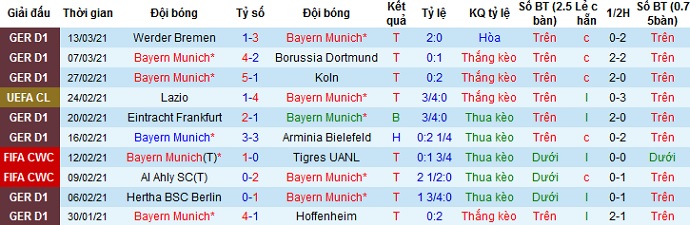 + Thống kê 10 trận gần nhất của Bayern Munich