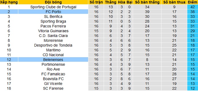 Sau 16 vòng đấu tại giải vô địch quốc gia Bồ Đào Nha, Belenenses vẫn đang đứng ở nửa dưới bảng xếp hạng vị trí thứ 12. Với 15 điểm có được, Belenenses chỉ hơn đội phải thi đấu play-off trụ hạng 1 điểm cũng như hơn nhóm cầm đèn đỏ 2 điểm mặc dù đang đứng trên 4 bậc.