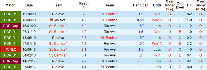 Thật vậy, Benfica toàn thắng cả 6 lần so tài gần nhất trên mọi đấu trường với Rio Ave. Nếu tính riêng các trận đấu diễn ra tại sân Da Luz, chuỗi chiến thắng của Benfica trước Rio Ave là 8.
