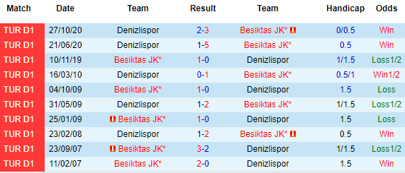 + Lịch sử đối đầu Besiktas vs Denizlispor