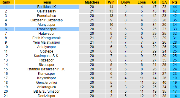 Đụng độ với Trabzonspor trên sân nhà, lẽ dĩ nhiên Besiktas hướng tới mục tiêu giành 3 điểm. Trabzonspor không phải đối thủ dễ chơi và CLB này hiện cũng đang hướng tới mục tiêu giành vé dự Cúp châu Âu. Dù đứng thứ 7 nhưng vào thời điểm hiện tại, Trabzonspor chỉ kém đối thủ xếp thứ 4 có 2 điểm.