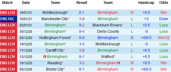+ Thống kê 10 trận gần nhất của Birmingham
