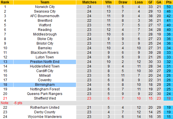 Ngay cả khi chơi trên sân nhà, Birmingham cũng không tận dụng tốt khi từ tháng 11 năm ngoái đến nay với tổng cộng 8 lần tiếp đón các đối thủ gần đây chỉ biết đến hòa và thua. Bên phần sân đối diện, Preston NE có hàng tấn công tốt hơn Birmingham tới 12 bàn là chi tiết đáng để chờ đợi vào đội khách.