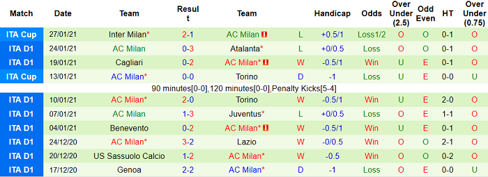 - Thống kê 10 trận gần nhất của AC Milan