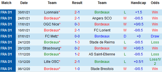 + Thống kê 10 trận gần nhất của Bordeaux