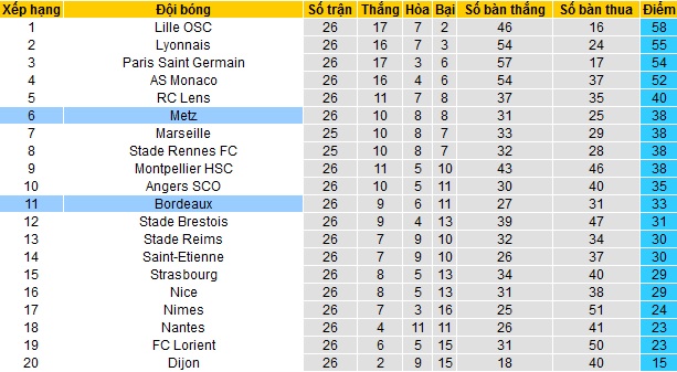 Trong khi đó Metz đang đứng ở vị trí thứ 6 trên bảng xếp hạng với 38 điểm cũng sau 28 vòng đấu. Hiện giờ Metz chỉ còn cách Top 5 có đúng 2 điểm nên hoàn toàn có cơ hội giành 1 suất dự cúp châu Âu mùa tới.