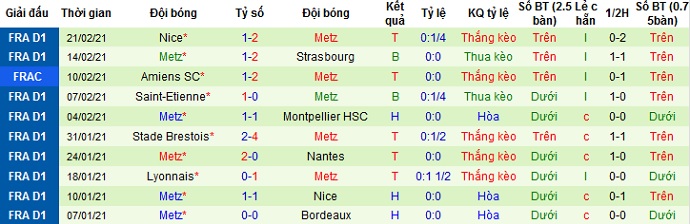 + Thống kê 10 trận gần nhất của Metz