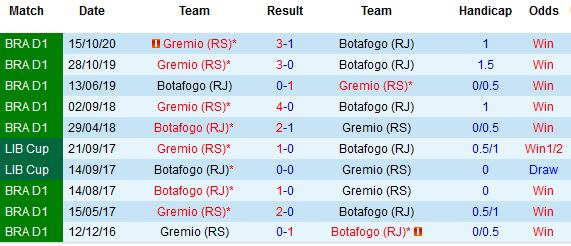 + Lịch sử đối đầu Botafogo vs Gremio