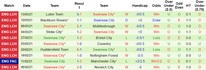 Swansea là chuyên gia thắng kèo của Championship 2020/21. Tỷ lệ thắng kèo của họ tại Championship mùa này lên tới 65.71%, cao nhất giải đấu và dĩ nhiên ấn tượng hơn nhiều so với 38.89% của Bournemouth. Giới đầu tư vì thế nên tiếp tục đặt niềm tin vào Swansea để thu về lợi nhuận.