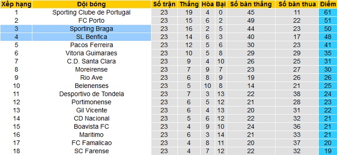 Bảng xếp hạng giải VĐQG Bồ Đào Nha trước vòng 24