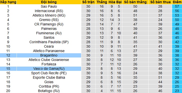 Bảng xếp hạng giải VĐQG Brazil vòng 30