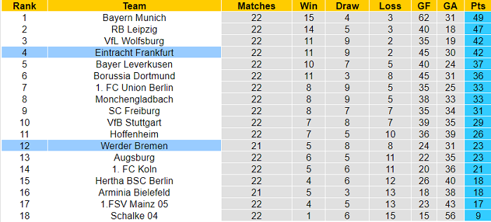 Phong độ và thống kê đối đầu Bremen - Eintracht Frankfurt