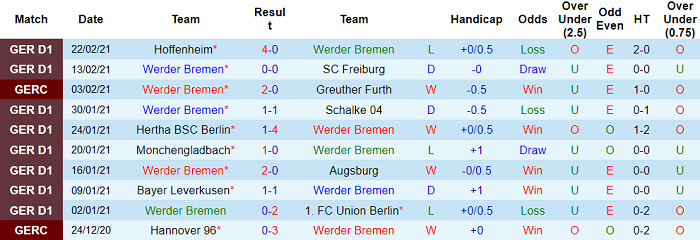 - Thống kê 10 trận gần nhất của Bremen