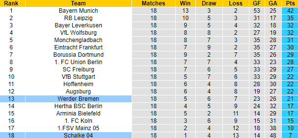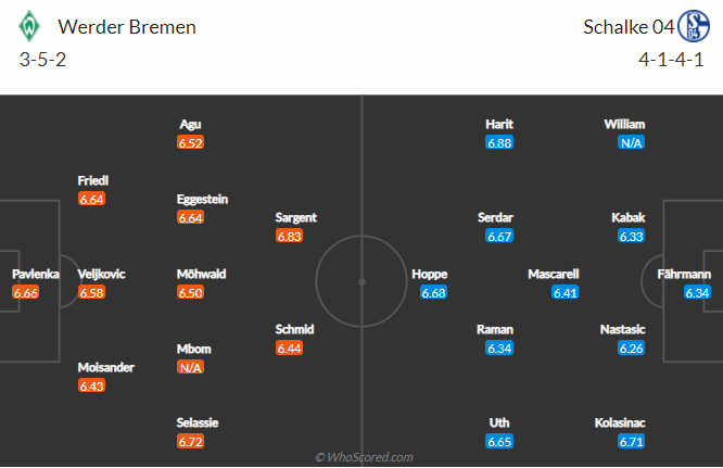 Bremen toàn thắng cả 2 trận đối đầu gần đây dù phải làm khách trên sân của Schalke. Trận đấu sắp tới với lợi thế về mặt sân bãi, Bremen càng được tin tưởng hơn vào khả năng giành chiến thắng. Sau 18 vòng đấu tại Bundesliga mùa này, Bremen giành 21 điểm, xếp thứ 13 trên bảng xếp hạng. Thành tích chưa được tốt nhưng gần đây, Bremen đang cho thấy dấu hiệu khởi sắc.