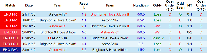 - Lịch sử đối đầu Brighton vs Aston Villa
