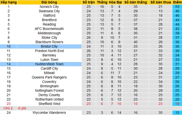 Trong khi đó Huddersfield đang xếp dưới đối thủ 4 bậc với chỉ có 31 điểm sau 25 trận đã đấu. Tuy nhiên khoảng cách của Huddersfield với nhóm các đội cầm đèn đỏ vẫn khá an toàn khi đang là 11 điểm.