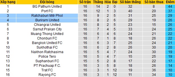 Sau 16 vòng đấu tại giải vô địch quốc gia Thái Lan, Buriram United và Ratchaburi đang đứng ngay sát nhau trên bảng xếp hạng. Trong khi Buriram United đứng ở vị trí thứ tư với 26 điểm thì Ratchaburi đứng trên ở vị trí thứ ba với 3 điểm nhiều hơn.