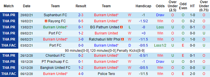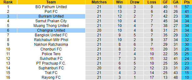 Buriram bất bại cả 9 lần đối đầu Chiangrai trước đây trên sân nhà tại giải VĐQG Thái Lan với 8 chiến thắng và 1 trận hoà. Trên bảng xếp hạng Thai League 2020/21, Buriram đang xếp trên Chiangrai 3 bậc. Cụ thể, Buriram xếp thứ 3 với 38 điểm, Chiangrai xếp thứ 6 với 34 điểm.