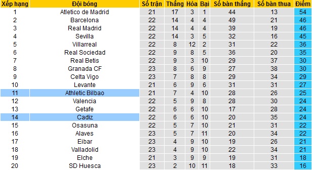 Là tân binh của La Liga khi mới chỉ thăng hạng ở mùa giải này nhưng Cádiz thi đấu không đến mức quá tệ tại giải đấu mới. Hiện tại đội bóng đang đứng thứ 14 trên bảng xếp hạng với 24 điểm sau 22 vòng đấu. Tuy đứng trên nhóm các đội cầm đèn đỏ tới 4 bậc nhưng khoảng cách hiện đang chỉ là 3 điểm.