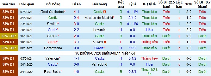 + Thống kê 10 trận gần nhất của Cádiz