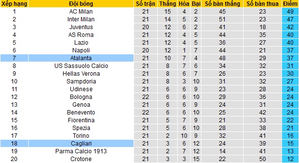 Tuy nhiên phong độ của Cagliari thì vẫn đang lao dốc không có điểm dừng khi đã 14 trận liên tiếp đội bóng không biết tới chiến thắng. Đáng nói là trong 9 trận gần đây Cagliari chỉ có được duy nhất 1 trận hòa, để thua ở cả 8 trận còn lại, bao gồm cả trận thua trước chính Atalanta tại cúp quốc gia,