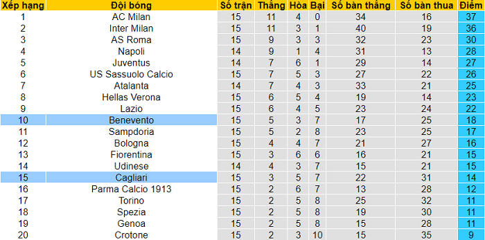 Cagliari không thu về những kết quả tích cực trong thời gian qua. Họ không thắng cả 8 vòng đấu gần đây: hòa 4, thua 4. Chuỗi thành tích đáng thất vọng này khiến Cagliari rơi xuống vị trí thứ 15. Họ chỉ còn hơn nhóm ‘cầm đèn đỏ’ 4 điểm trước khi vòng 16 khởi tranh.